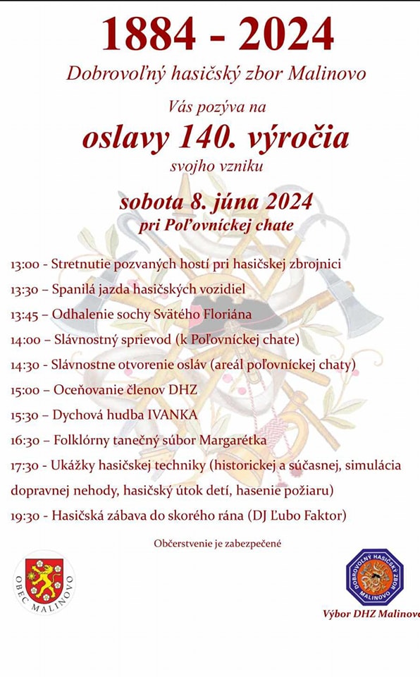 Dobrovoľnícky hasičský zbor Malinovo Vás srdečne pozýva na oslavy 140.
