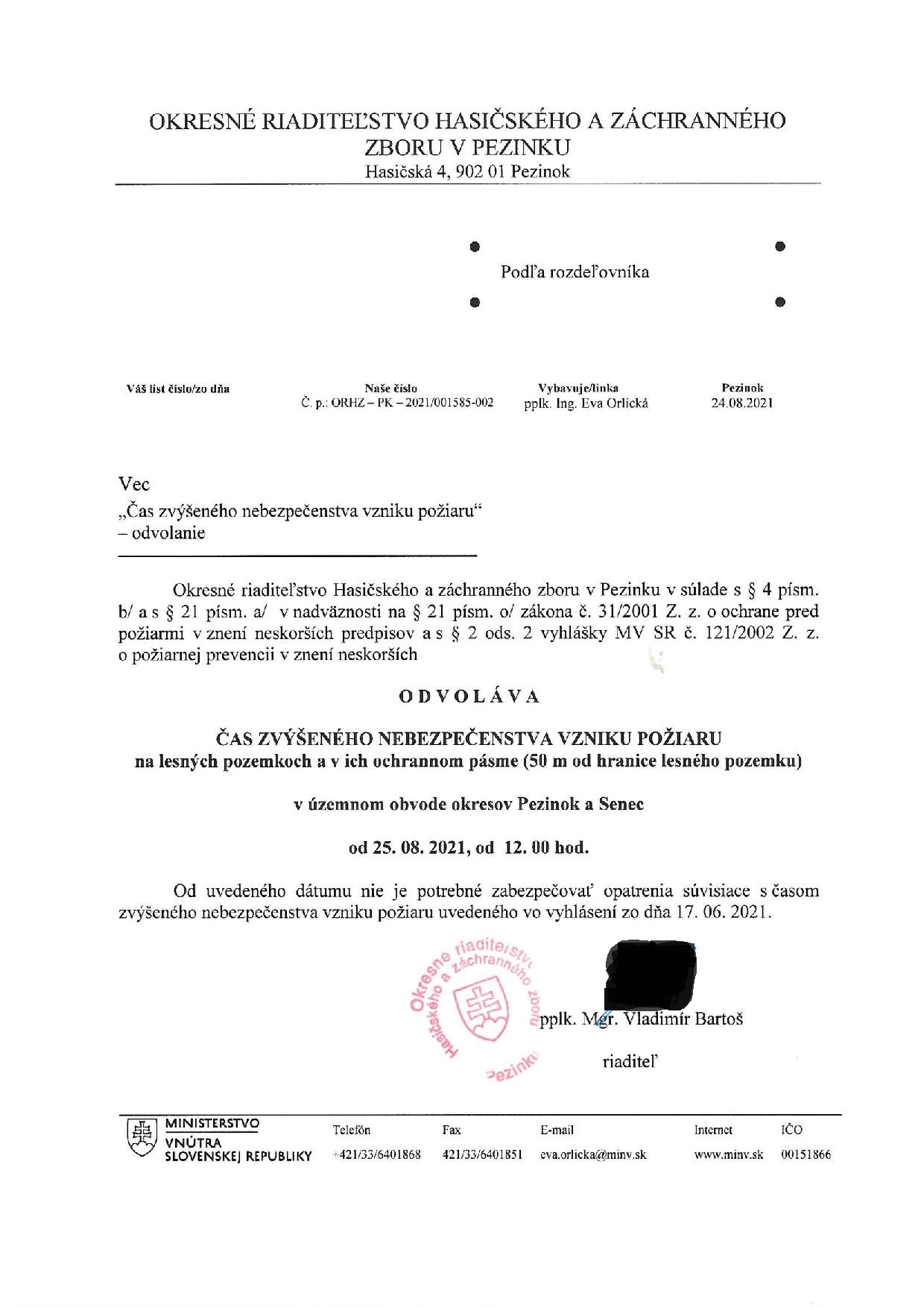 ČAS ZVÝŠENÉHO NEBEZPEČENSTVA VZNIKU POŽIAROV - ODVOLANIE