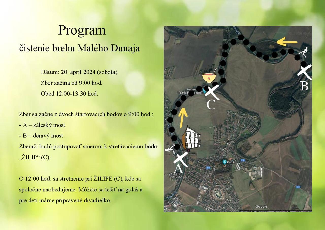 Milí občania, spojte príjemné s užitočným a vyberte sa v sobotu 20. apríla 2024 na čistenie brehu Malého Dunaja, kde bude prebiehať náš tradičný zber odpadkov.