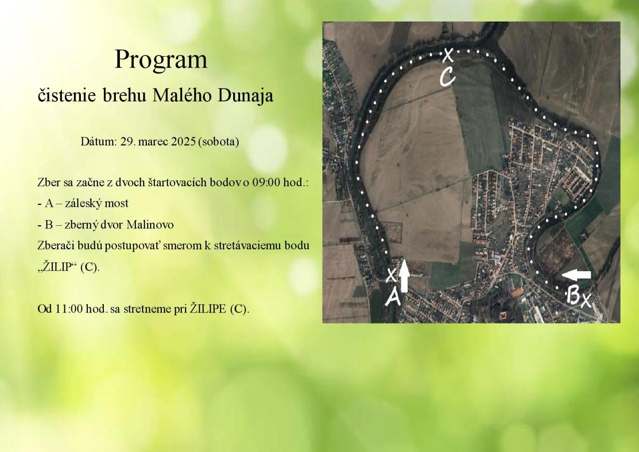 Milí občania, spojte príjemné s užitočným a vyberte sa v sobotu 29. marca 2025 na čistenie brehu Malého Dunaja, kde bude prebiehať náš tradičný zber odpadkov.