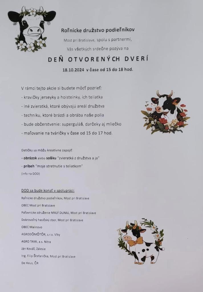 Roľnícke družstvo Most pri Bratislave spolu s partnermi Vás všetkých srdečne pozýva do ich areálu na DEŇ OTVORENÝCH DVERÍ a to dňa 18.10.2024 v čase od 15:00 do 18:00 hod.
