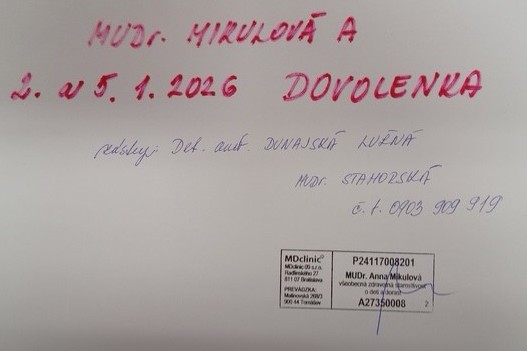 Detská lekárka v Tomášove oznamuje svojim pacientom, že v nasledujúcich dňoch nebude ordinovať z dôvodu čerpania dovolenky: