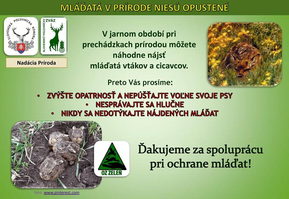 opäť sa nachádzame v období kladenia mláďat našej voľne žijúcej zveri na našich poliach a v lesoch. Nakoľko toho životného priestoru majú čoraz menej a menej, chceme Vás poprosiť, aby ste Vaše prechádzky v tomto období obmedzili na minimum a hlavne, aby ste Vašich psíkov v žiadnom prípade nepúšťali na voľno.