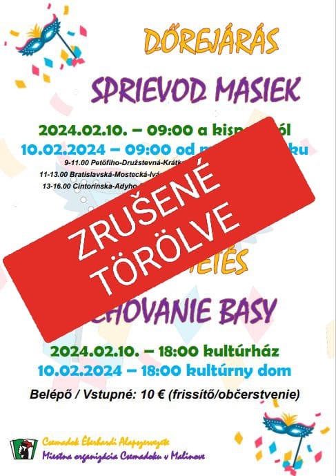 Oznamujeme občanom, že dnešný sprievod masiek a pochovanie basy sa z vážnych dôvodov rušia. Ďakujeme za pochopenie