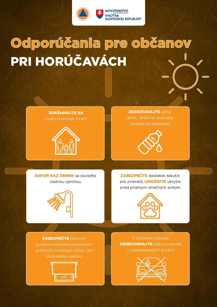 Vysoká teplota predstavuje potenciálne nebezpečenstvo pre ľudské zdravie, fyzické aktivity a tvorbu požiarov. Ak je to možné, vyhýbajte sa slnku a pite dostatok tekutín