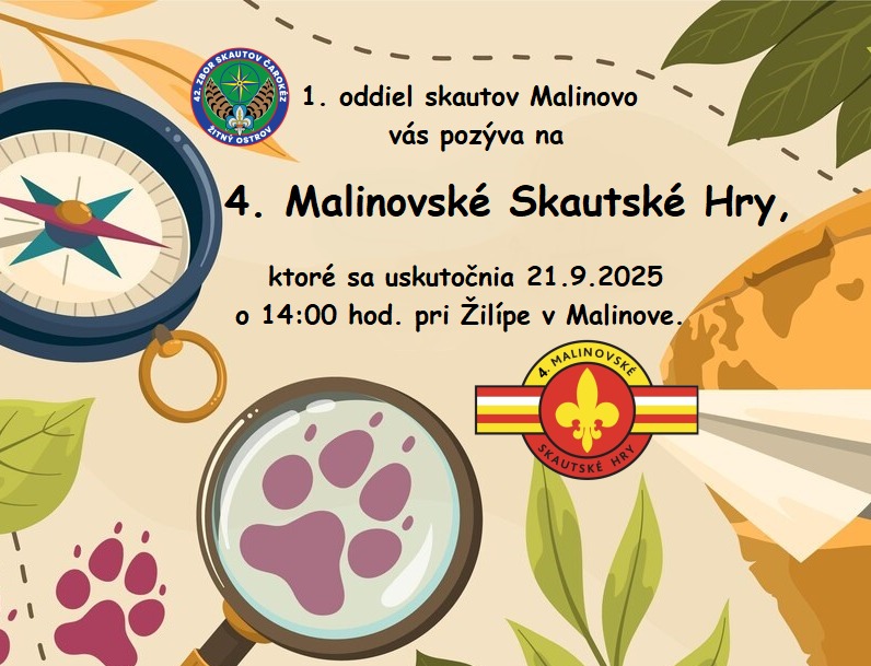 1. oddiel skautov Malinovo Vás pozýva na 4. ročník Malinovských Skautských Hier, ktoré sa uskutočnia 21. septembra 2025 o 14:00 pri Žilípe v Malinove. Príďte ich povzbudiť a vyskúšať si niečo zo skautskej teórie a praxe.