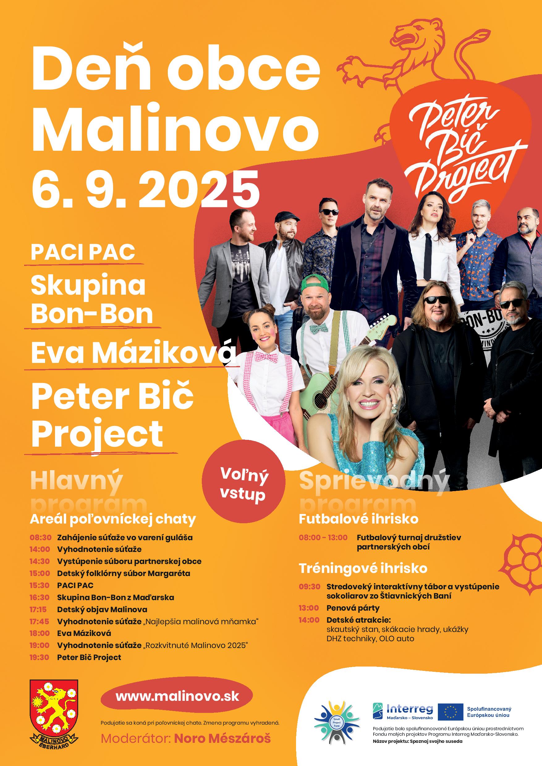 Popoludní sa program presunie k pódiu v areáli poľovníckej chaty, kde po vyhodnotení gulášovej súťaže vystúpi dámsky spevácky súbor z Héderváru a naša DFS Margaréta. Deti roztancuje obľúbená skupina PACI PAC a dospelí si užijú koncert maďarskej kapely Bon-Bon. Predstavíme aj detský talent z Malinova a vyhlásime víťazov súťaží „Najlepšia malinová mňamka“ a „Rozkvitnuté Malinovo“.