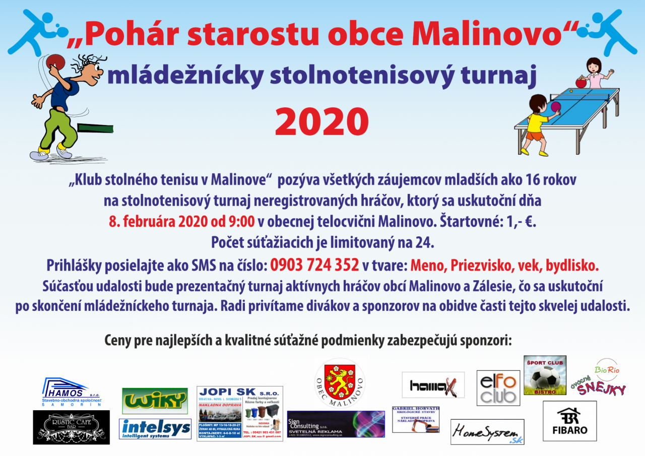 Klub stolného tenisu v Malinove pozýva všetkých záujemcov mladších ako 16 rokov na stolnotenisový turnaj v Malinove. Bližšie informácie nájdete v priloženom plagáte.