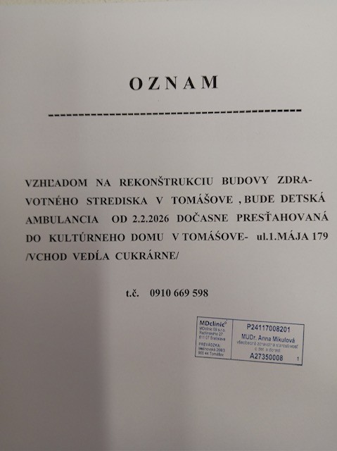 Detská lekárka v Tomášove oznamuje svojim pacientom, že vzhľadom na rekonštrukciu budovy zdravotného strediska v Tomášove, bude detská ambulancia od 2.2.2026 dočasne presťahovaná do kultúrneho domu v Tomášove.