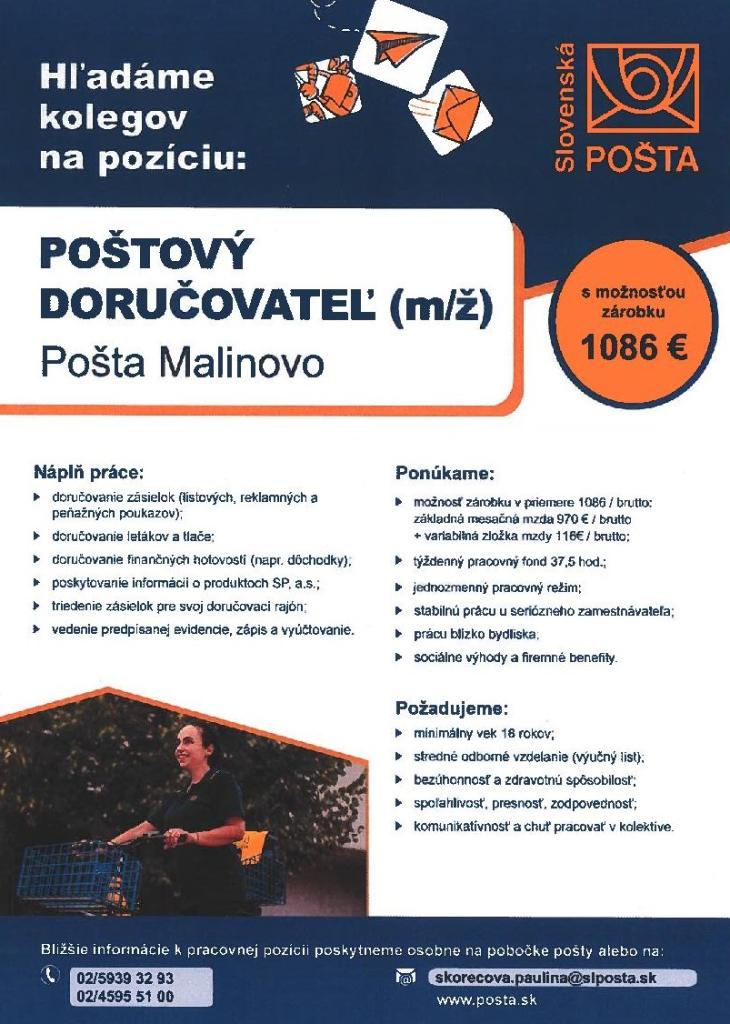 Pošta Malinovo hľadá do TPP doručovateľa / doručovateľku na doručovanie. Viac informácií na letáčiku nižšie.