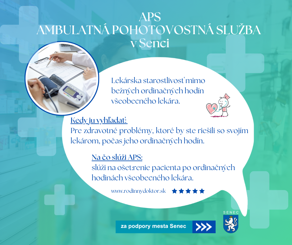 APS je určená pre všetkých obyvateľov okresu Senec, ktorí potrebujú neodkladné ošetrenie mimo bežných ordinačných hodín svojho všeobecného lekára.