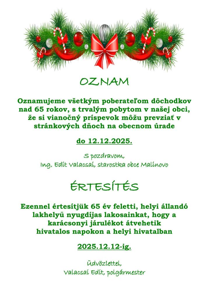 Oznamujeme všetkým poberateľom dôchodkov nad 65 rokov, s trvalým pobytom v našej obci, že si vianočný príspevok môžu prevziať v stránkových dňoch na obecnom úrade do 12.12.2025.