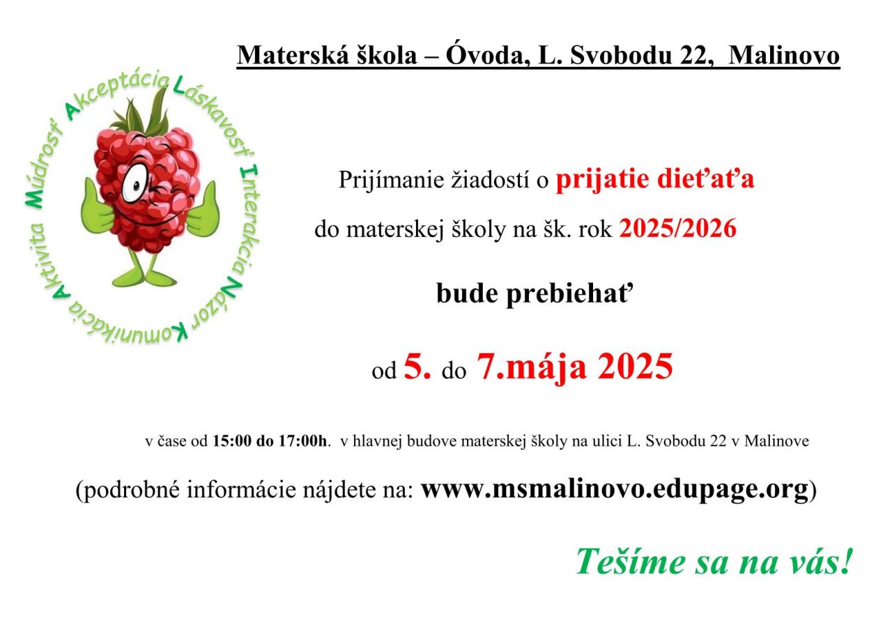 Prijímanie žiadostí o prijatie dieťaťa do materskej školy na šk. rok 2025/2026 bude prebiehať od 5. do 7.mája 2025. Podrobné informácie nájdete na web stránke materskej školy.